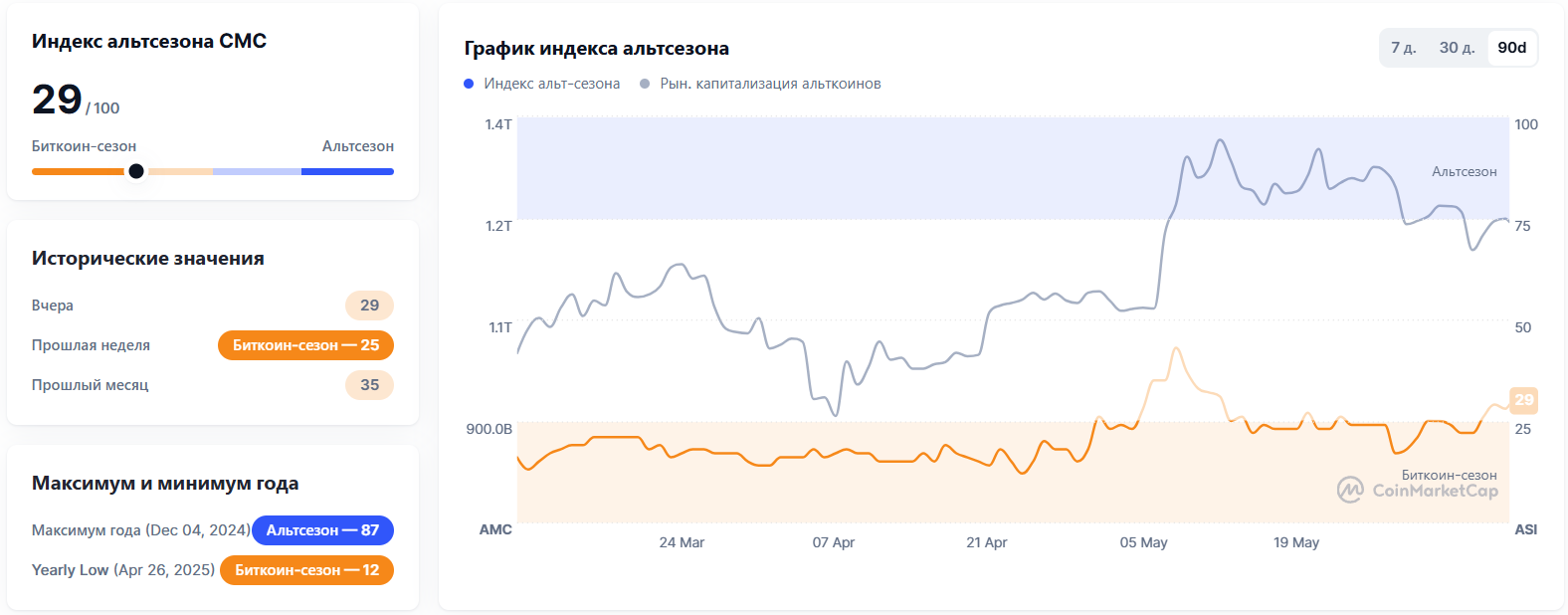 Индекс отслеживает долю альткоинов, которые показали лучшую доходность, чем биткоин, за последние 90 дней. Если таких — больше 75%, начинается альтсезон.