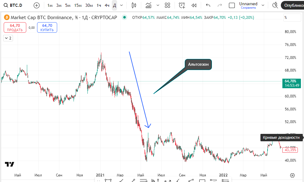 - CoinMarketCap: наблюдает, что когда доля BTC на рынке падает ниже 45%, начинается агрессивный рост по альтам.