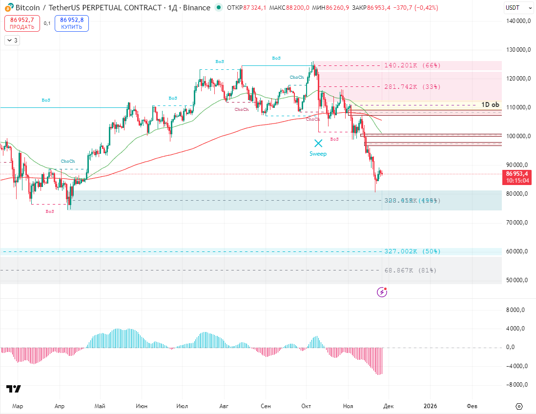 Bitcoin рухнул с октябрьского исторического максимума $126,000 до $80,542 к 21 ноября. Падение на 35% за полтора месяца. Это не просто коррекция — это самая жёсткая просадка с момента установки ATH. И что особенно болезненно: цена опустилась до уровней апреля 2025 года, то есть откатила всё весеннее и летнее ралли.