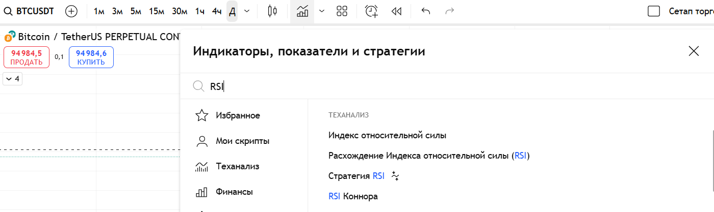 - TradingView: индикатор доступен по умолчанию. Можно искать по ключевому слову: “Relative Strength Index”;