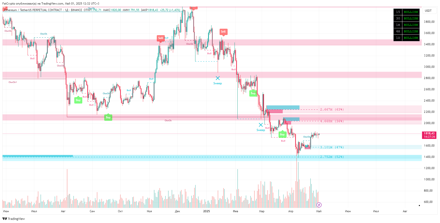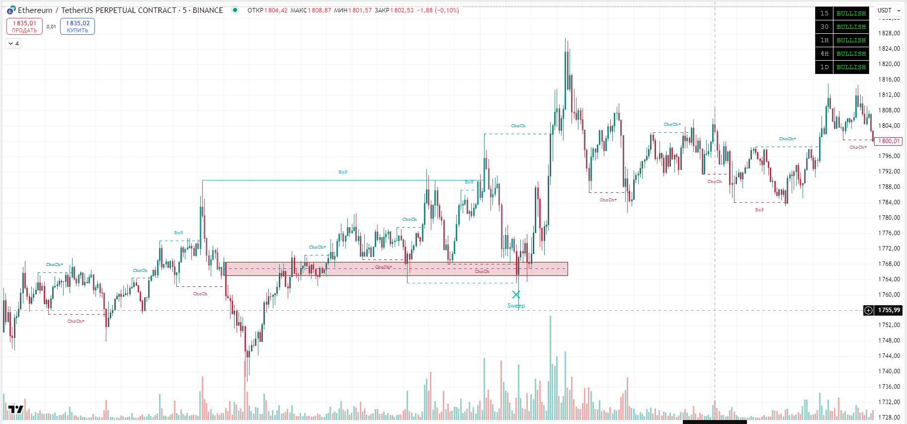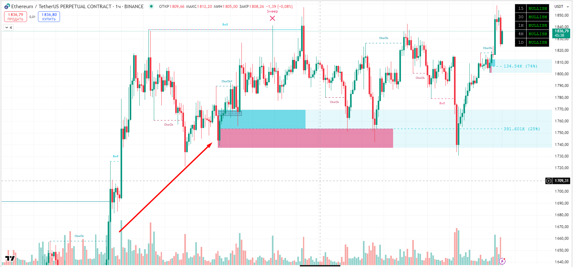 - Сломом структуры: Чтобы убедиться в изменении тренда.
