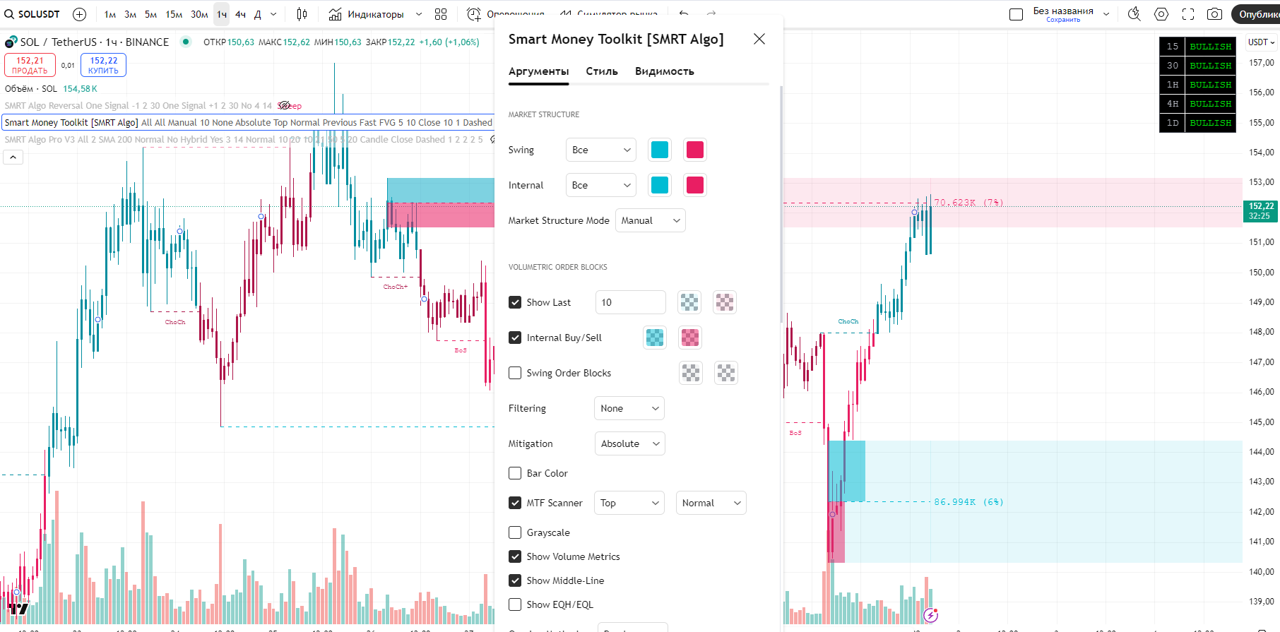 - Используйте индикаторы: для автоматизации используйте современные индикаторы, такие как Smart Money Suite от smrtalgo.com, который не только находит ордер-блоки, но и показывает, кто в них преобладает – покупатель или продавец.