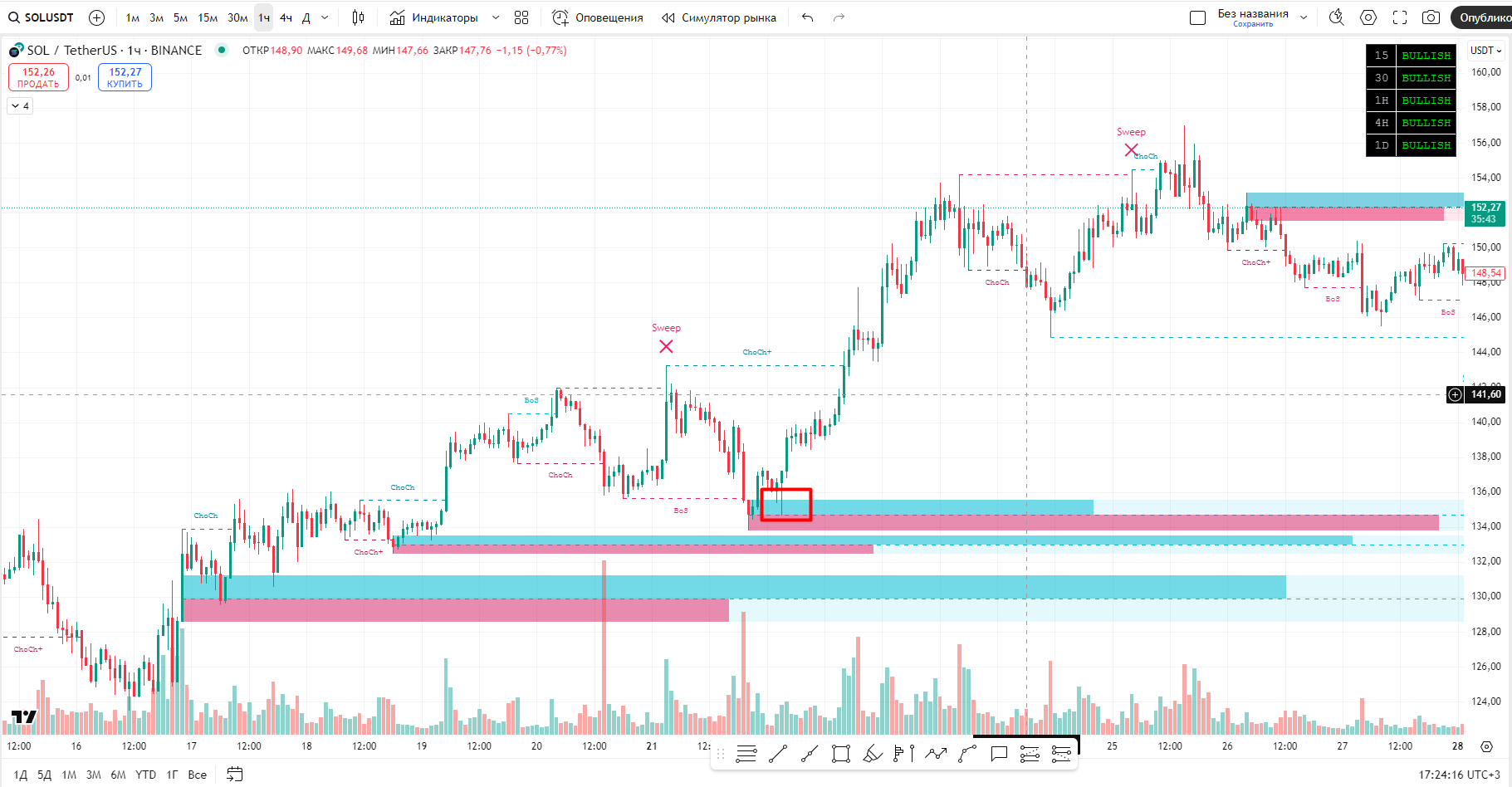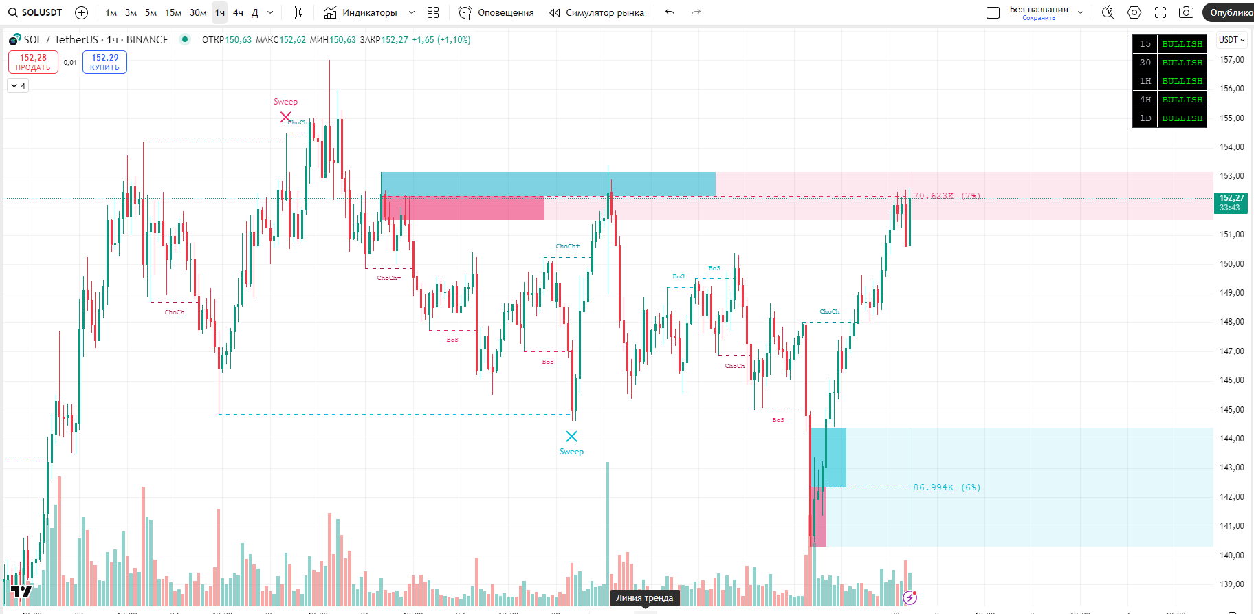 - Уровнями ликвидности: Чтобы понять, где цена собирает стоп-лоссы.
