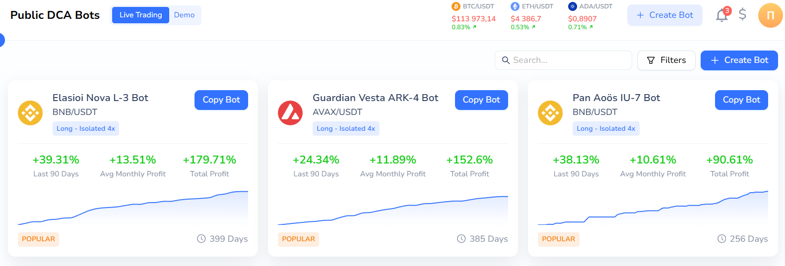 DCA-боты (Dollar Cost Averaging) Классические боты для усреднения позиции. Покупают актив частями при снижении цены, снижая среднюю точку входа.