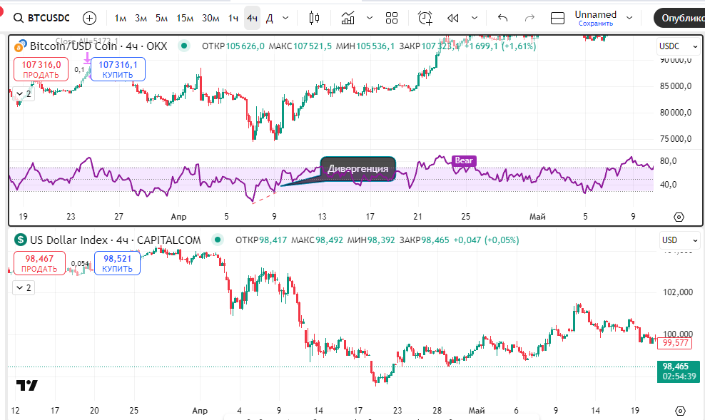 2. Связка DXY + RSI на BTC-графике
