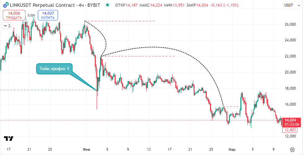 Первый тейк-профит на $17.71, но трейдер решил дать шорту шанс и поставил трейлинг-стоп на $22.