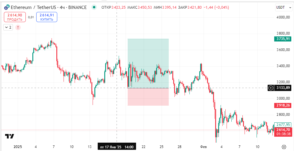 Трейдер из команды Octobit открывал лонг по Ethereum 19 января 2025 года на уровне $3 133, видя уверенное снятие ликвидности, реверс (преодоление проблемной зоны в виде медвежьего FVG + CHOCH. Все по стратегии смарт мани. Стоп ставил за свечу, которая снимала ликвидность.