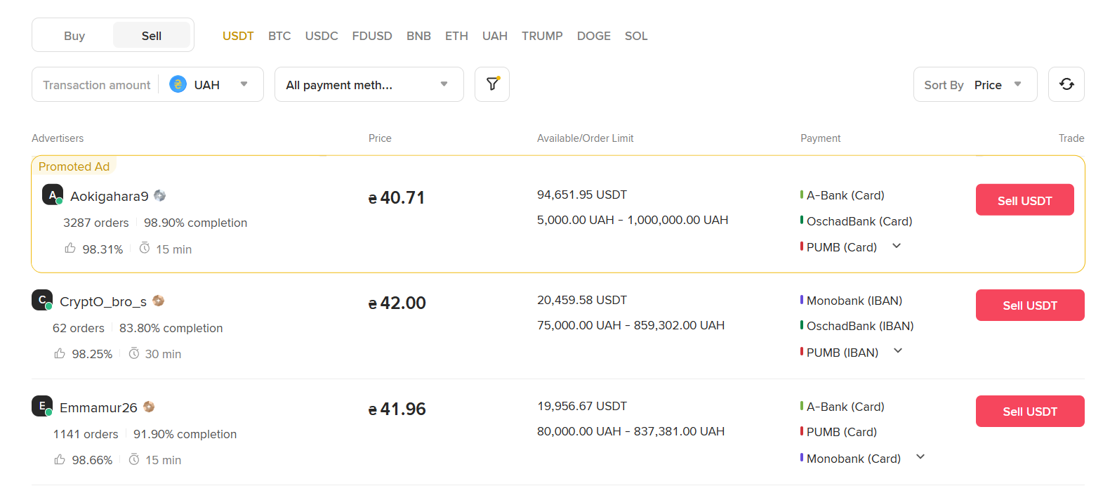 Выберите «Продать UAH» → укажите банк (ПриватБанк, Монобанк, Ощадбанк) → выберите предложение с самым выгодным курсом. - Подтверждение операции: