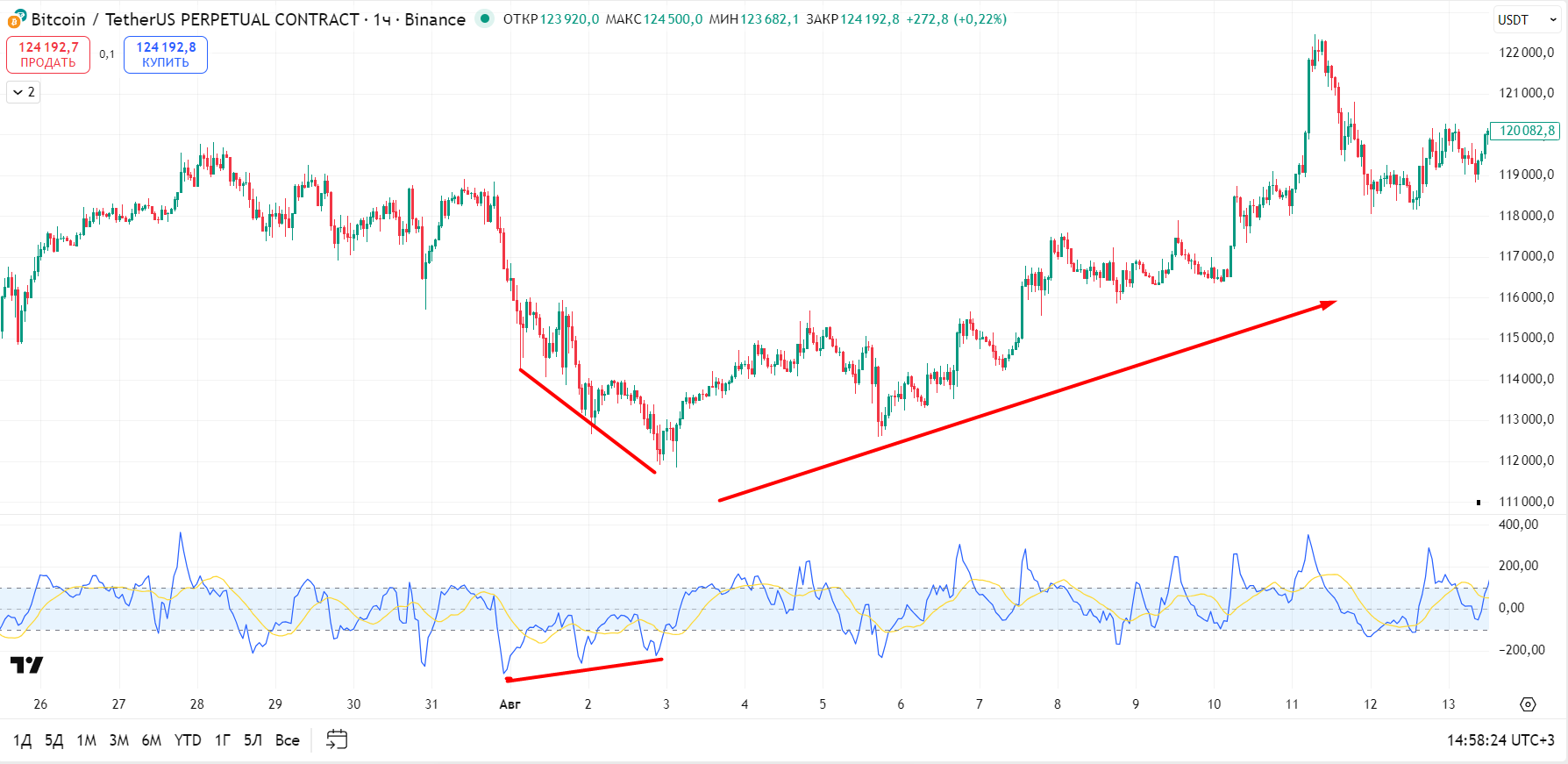 Мы начинаем с самого базового, но при этом важного сигнала — дивергенции. Если коротко — это когда цена и осциллятор «смотрят в разные стороны». Такое расхождение может предупреждать об окончании движения.