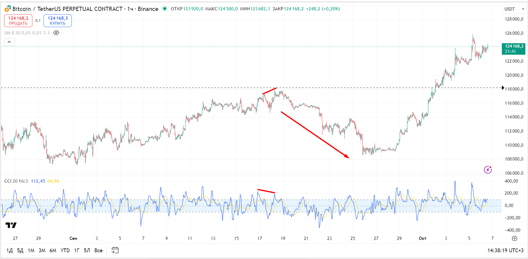 Дивергенция — это когда цена и индикатор начинают показывать разное направление. Например, цена обновляет максимум, а осциллятор — нет. Это может быть сигналом, что импульс ослабевает.