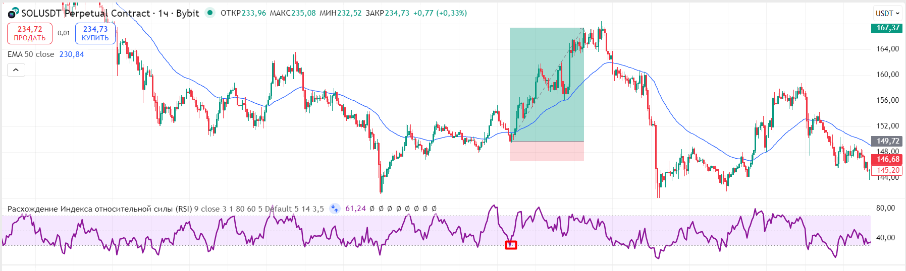 - Индикаторы: RSI (14), EMA (50)