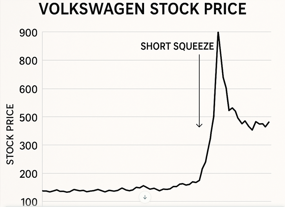 Один из самых громких шорт-сквизов в истории. Когда Porsche объявила о контроле над 74% акций VW, оказалось, что свободно торгуется менее 6% бумаг. Шортисты, державшие огромные позиции, оказались в ловушке: цена выросла в четыре раза за два дня, а VW ненадолго стал самой дорогой компанией в мире.