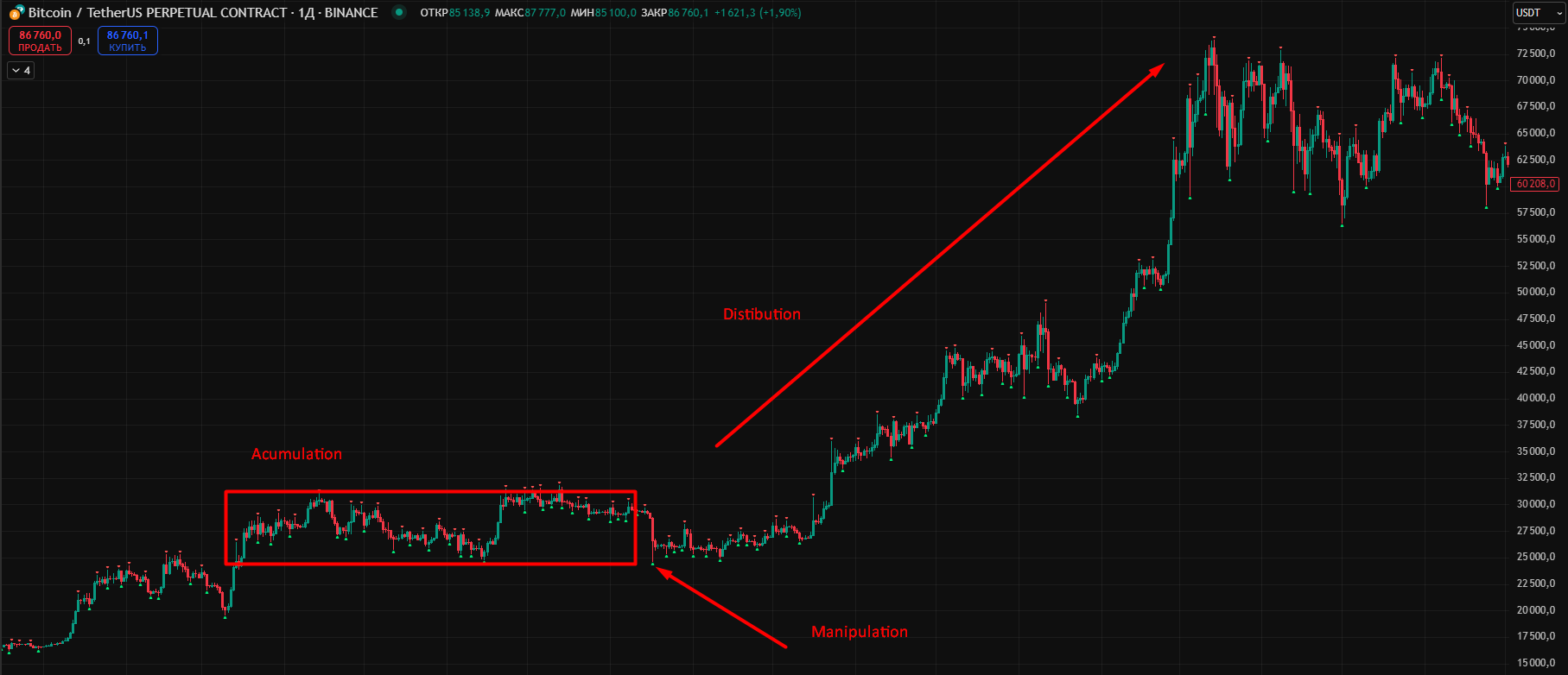 Пример из практики на криптовалютном рынке: На графике BTC/USD 2023 года четко прослеживается модель AMD. Накопление происходило в диапазоне $24,700-$31,500, за которым последовало резкое падение до $24,581 (манипуляция), и распределение на уровнях $46,000-$48,000. Потом была небольшая коррекция и дальнейший рост до $75,000.