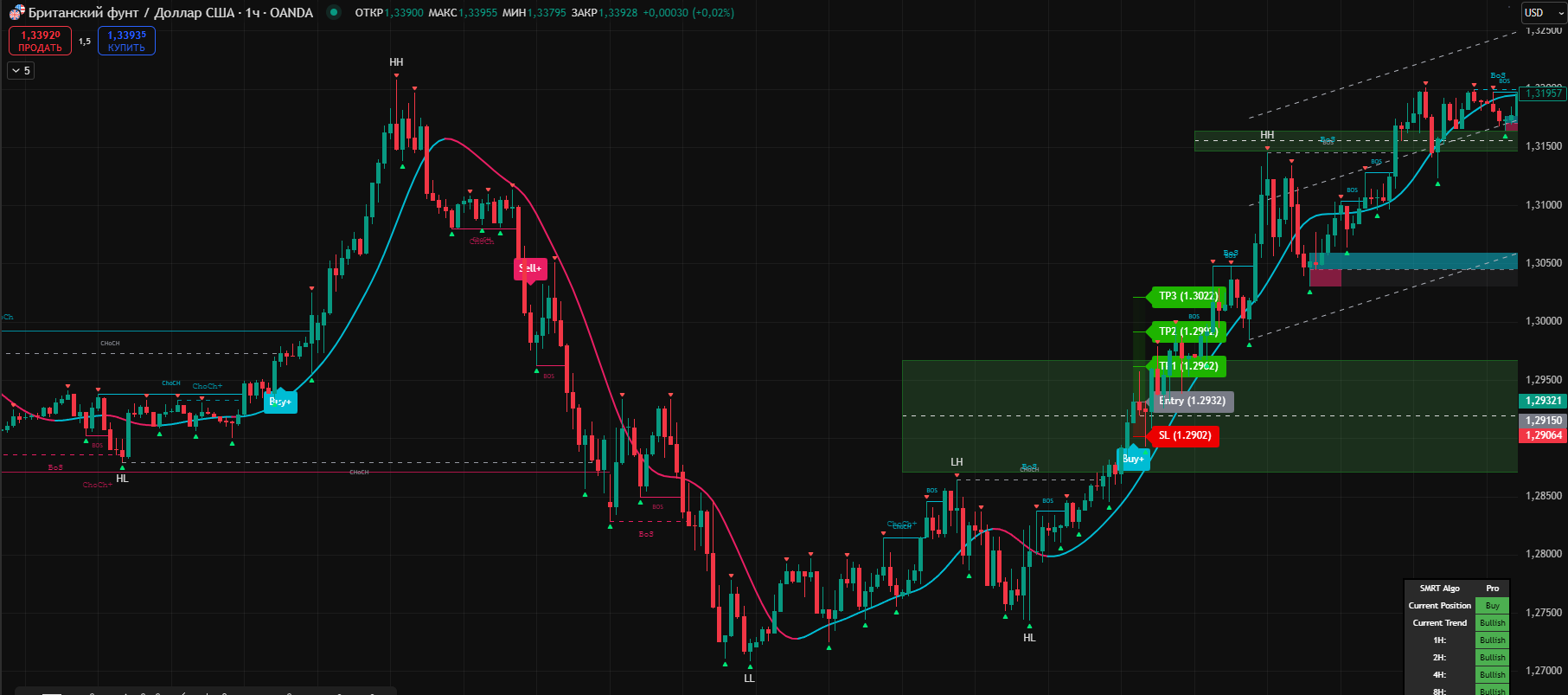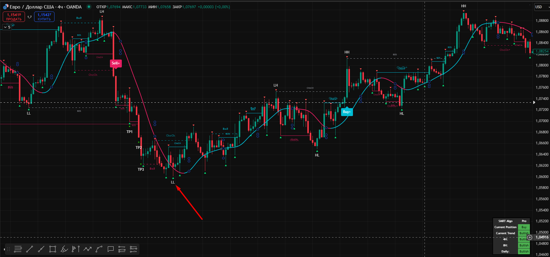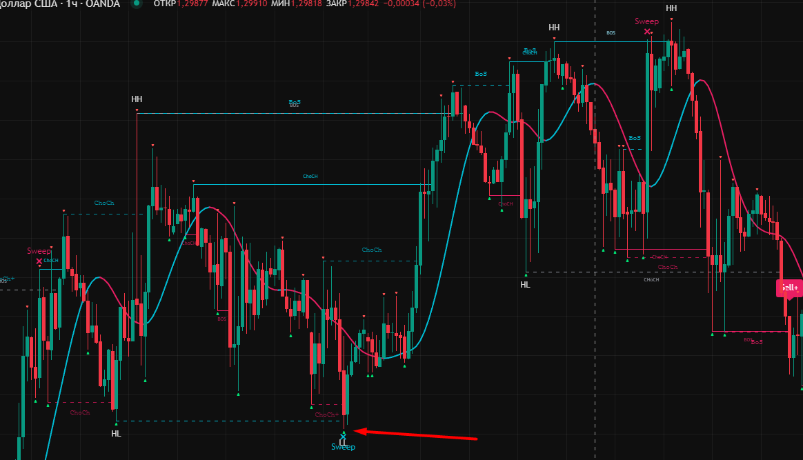 - BOS (Break of Structure): Полноценный пробой рыночной структуры с подтверждением на старшем таймфрейме.