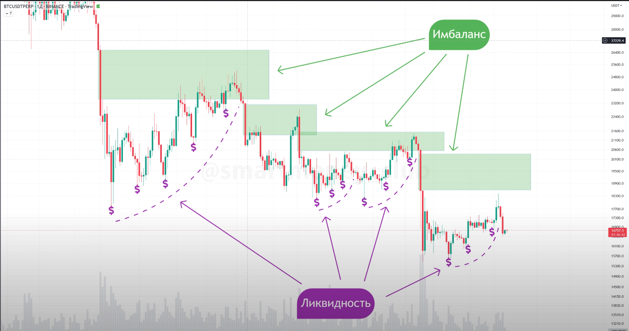 Итак, акцентируем ваше внимание снова. Цена всегда будет стремиться сделать две вещи: заполнить имбаланс и собрать ликвидность. Это два основных постулата концепции смарт-мани.