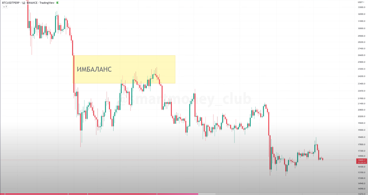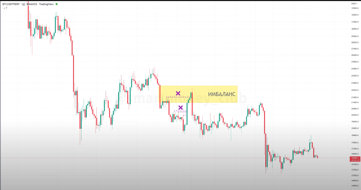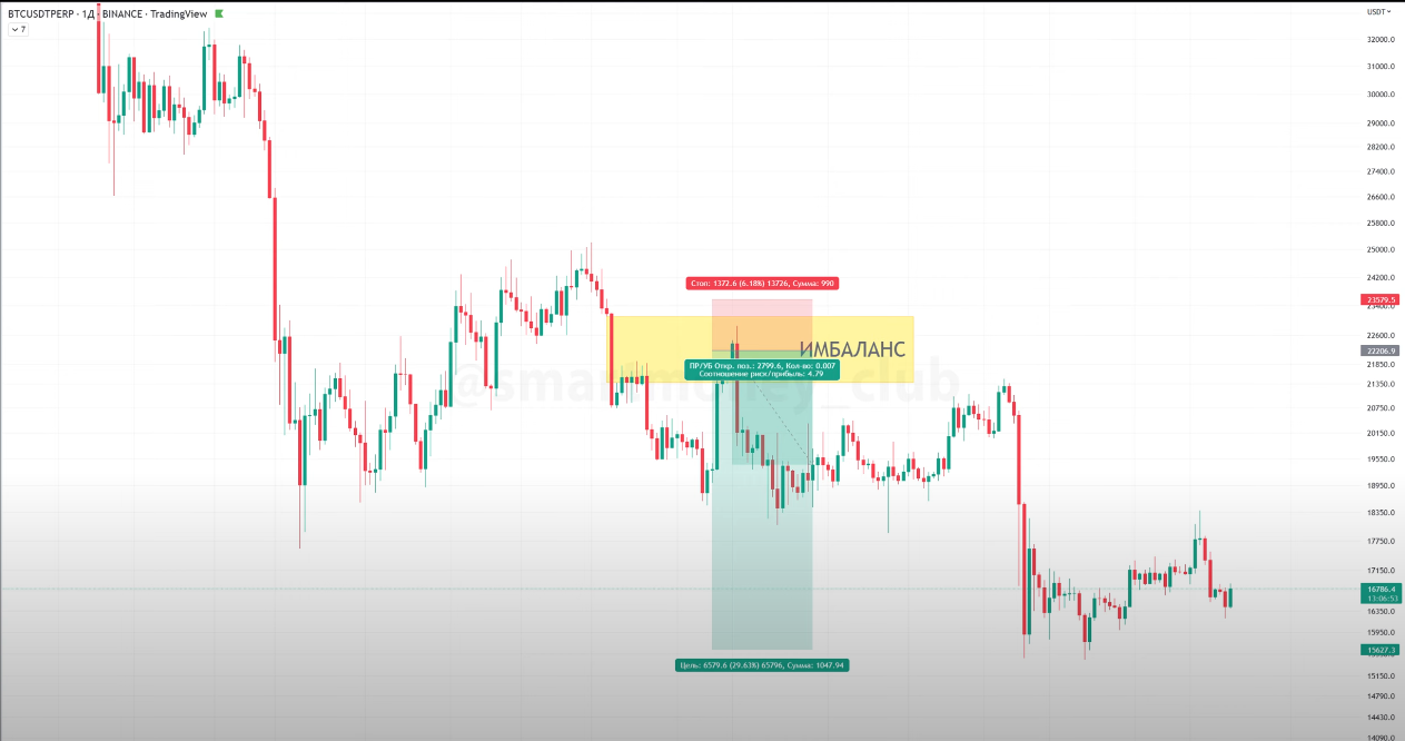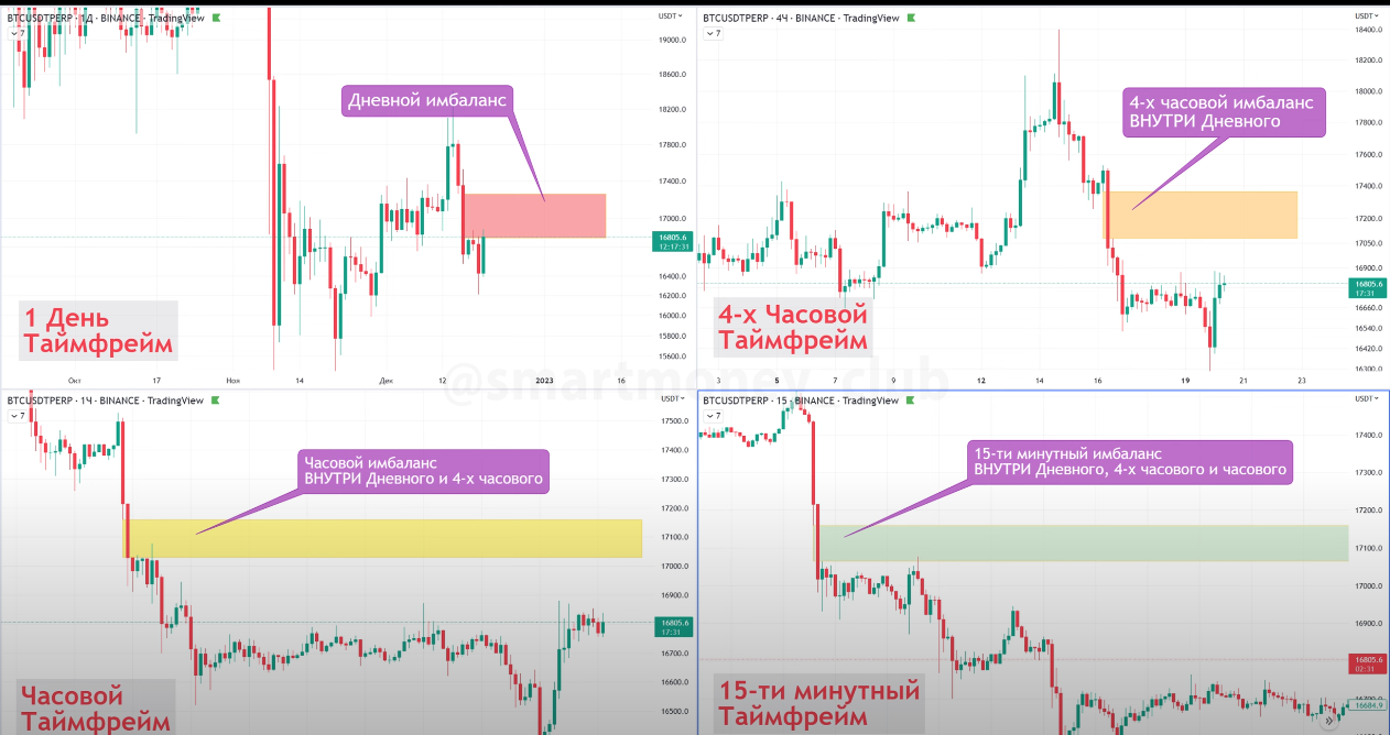 Более того, как правило, внутри дневного имбаланса вы найдете 4-часовой, часовой, 15-минутный имбаланс и так далее. Таким образом, переходя к младшему таймфрейму, вы сможете максимально точно определить потенциальную зону разворота цены и открыть более точную позицию.