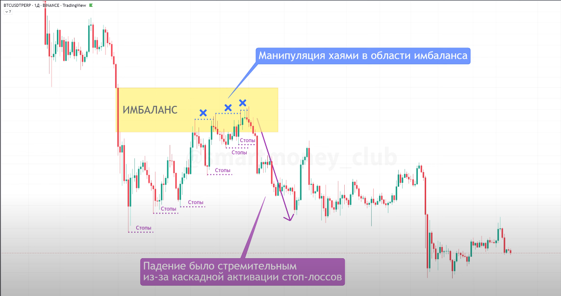 Умный капитал, проводя такую манипуляцию в области имбаланса, наполнял свои ордера в шорт. После того как набрался нужный объём шортовой позиции, произошла финальная манипуляция в виде небольшого скачка цены вверх, после чего пошло резкое движение в нисходящем направлении. В процессе происходила каскадная активация стоп-лоссов тех, кто заходил в лонг по ходу предыдущего движения.