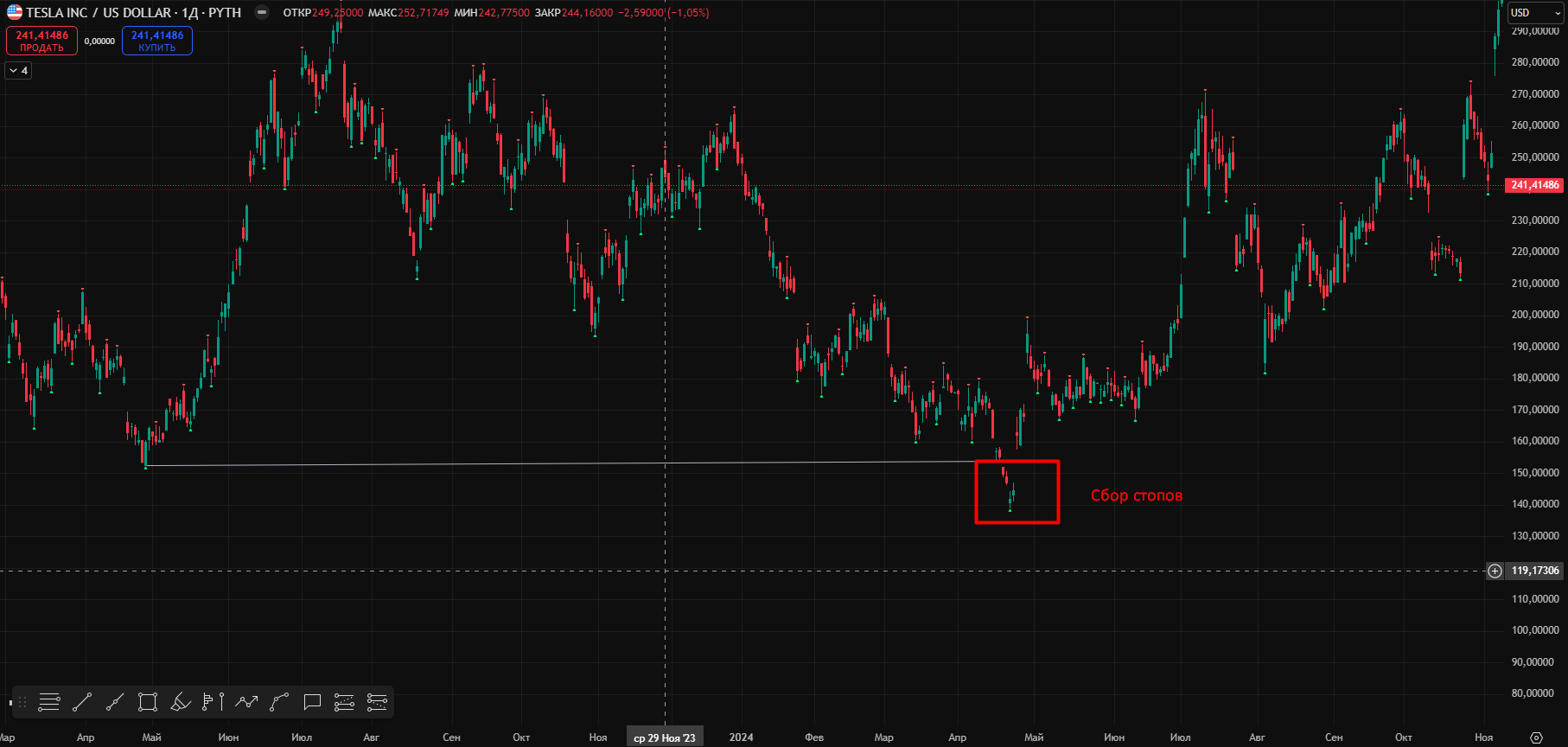 Кейс-стади: На примере акций TSLA за апрель 2024 виден классический “стоп-ралли” — цена пробила уровень $160, активировав скопление стоп-ордеров, после чего актив развернулся вверх на 22% за 3 дня длинными свечами.