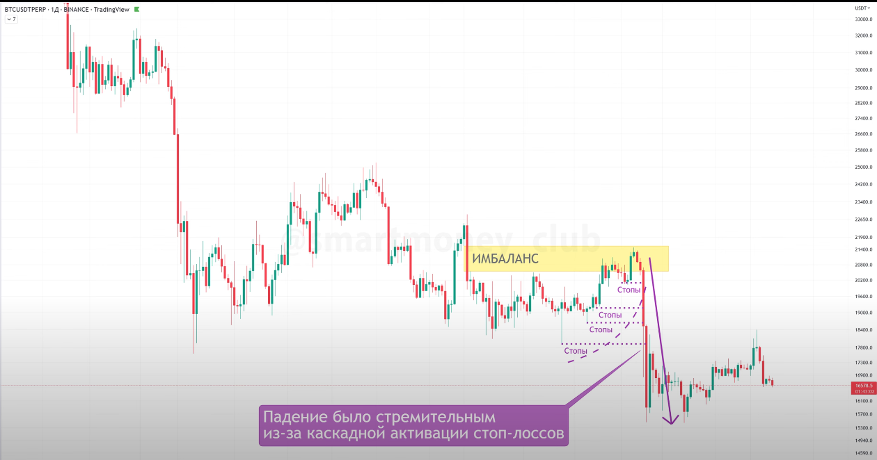 Стоп-лоссы, стоявшие за каждым из этих лоев, стали топливом для стремительного падения. Это также трендовая ликвидность, и когда лои или хаи находятся недалеко друг от друга, происходит их каскадная активация, а движение цены развивается резко и стремительно, как снежный ком. Это было весьма ожидаемо.