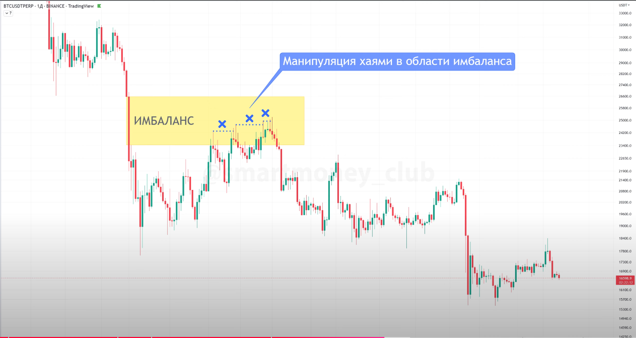 В области имбаланса мы наблюдаем манипуляцию хаями. Цена раз за разом обновляла ликвидность за этими хаями, выбивая стопы не информированных участников рынка, которые пытались шортить раньше времени.