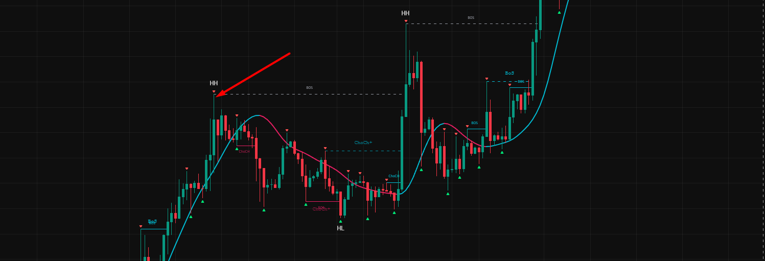 - CHoCH: Слом структуры. Первые признаки ослабления тренда без подтверждения пробоя.